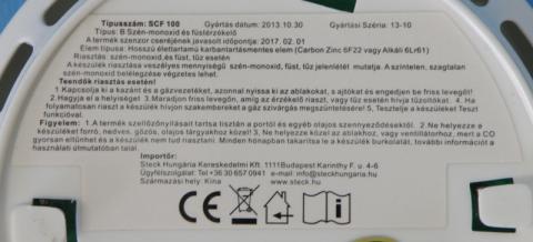 A termék steck! márkanevű, SCF 100 típusszámú, beépített elemes táplálású, elektrokémiai elven működő, B típusú, szén-monoxid és füstérzékelő. A kartondoboz csomagolású riasztó fehér színű műanyag háza kör alakú, átmérője: 125 mm, magassága: 40 mm. A termék két részből, a falra rögzíthető hátlapból, és az arra felcsavarható készülék részből áll. Ez utóbbi mellső oldalának közepén a steck! márkanév, a fényjelzésre szolgáló LED-ek ("POWER", "SMOKE" és "CO" feliratokkal) és a "TEST/RESET" felirattal ellátott, tesztelésre szolgáló nyomógomb helyezkedik el, a szélén – a műanyag burkolatba fröccsöntve – "TWIST TO REMOVE", "DO NOT PAINT" és "TWIST TO CLOSE" feliratok láthatóak. A riasztó hátoldalán került elhelyezésre a termék magyar nyelvű adattáblája, amelyen a típusszám, a gyártás dátuma, a gyártási széria száma, a CO-riasztó szabvány szerinti típusa (B típus), a készülék megnevezése és az érzékelt gáz típusa, a termék szenzor cseréjének javasolt időpontja, az alkalmazott elemre vonatkozó információk, különböző figyelmeztetések és útmutatók, az importőr neve és elérhetőségei, a származási hely, a CE megfelelőségi jelölés, az elkülönített hulladékgyűjtésre utaló áthúzott, kerekes gyűjtőedény ábrája, a beltéri használatra utaló ("házikó"), valamint a használati útmutató elolvasására utaló ("nyitott könyv") szimbólum látható. A fogyasztási cikk eladási ára: 6.999 Ft.