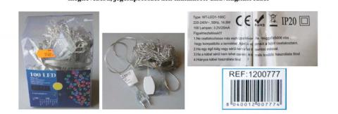 nem cserélhető LED-eket és további tagokkal való bővíthetőséget lehetővé tevő csatlakozóaljaztot tartalmazó, márkajelzés nélküli, a terméken és a csomagolódobozban elhelyezett tájékoztató lapon WT-LED1-100C típusjelölésű, a csomagolódobozban elhelyezett tájékoztató lapon 1200777 hivatkozási számú, "100 LED MINILUCI" és "világító asztali dísz" megnevezésű, jégcsapszerűen kialakított díszvilágítási füzér