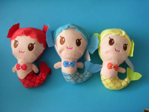 Piros, sárga és világoskék színű tapadókorongos plüss sellő figurák. A sellő nyakrészén csokornyakkendő látható, amelyet műanyag gyönggyel díszítettek.